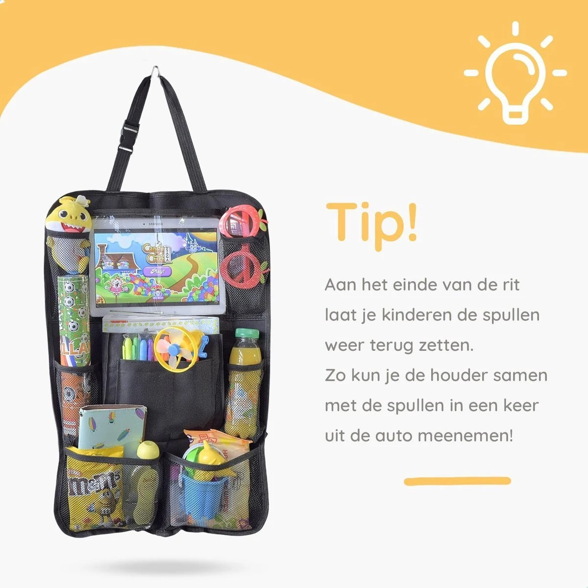 Ben jij ook klaar met de rotzooi die je kinderen achterin maken op vakantie? En ben jij op zoek naar een manier om je achterbank opgeruimd te houden. Dan is deze Dentools auto organizer perfect voor jou. Met deze organizer ben je voorzien van een iPad opberg vak, waarin je iPad nog bruikbaar blijft en dus een film kan kijken zonder de Ipad vast te houden, veel opbergvakken waarin je het overzicht van de inhoud behoudt, en ook nog eens een remedie tegen vieze voetafdrukken tegen je stoelen. Kortom, een ideale manier om je achterbank georganiseerd en speels te houden!