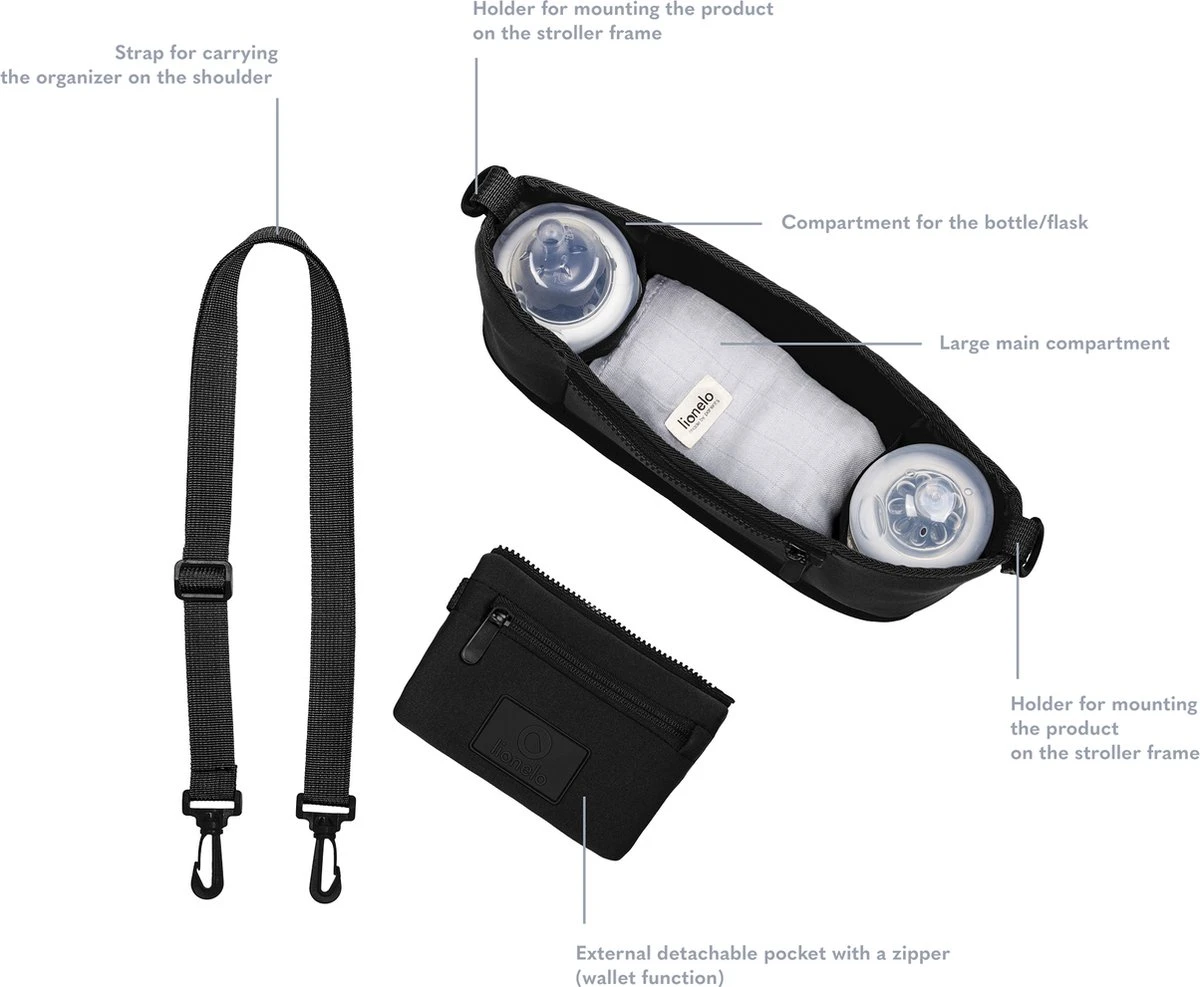 De Lionelo Cube organizer kan snel en stabiel op elke kinderwagen worden gemonteerd, waardoor zowel voedselflessen als noodzakelijke persoonlijke accessoires, d.w.z. sleutels, telefoon of smartphone, altijd in de buurt zijn.
