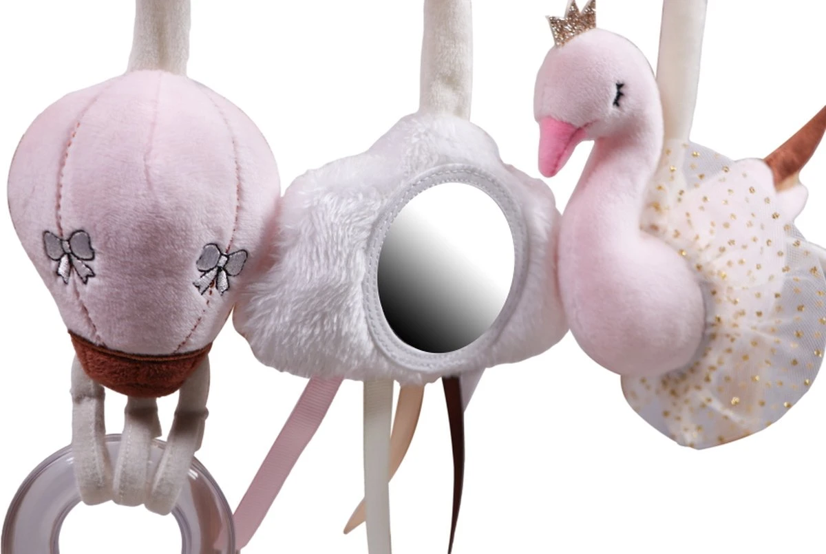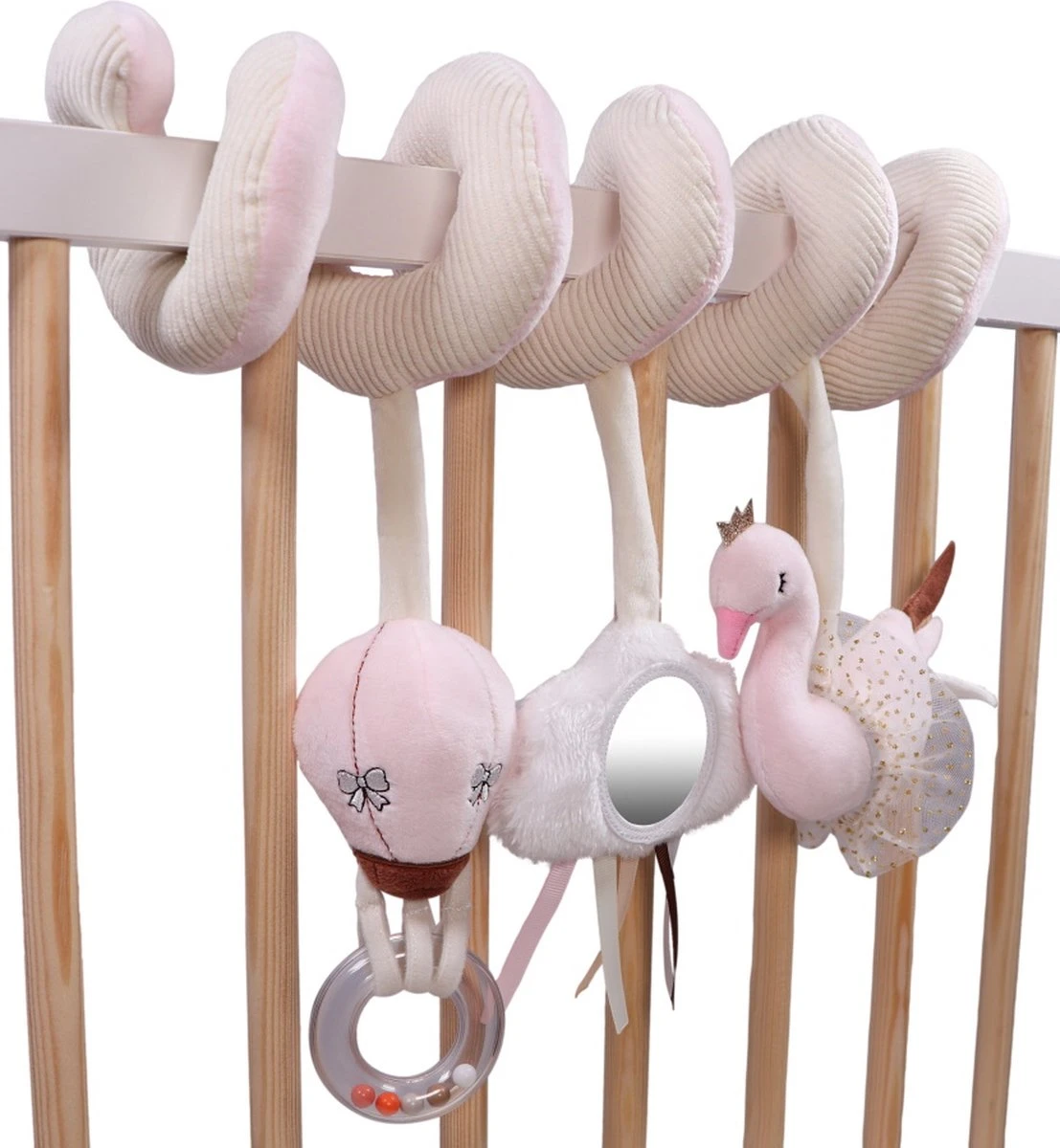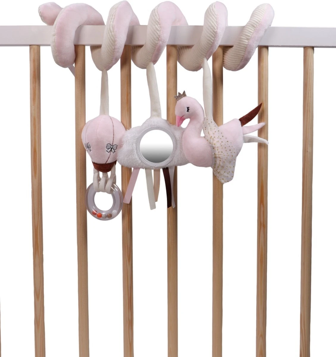 De boxspiraal bestaat uit een zwaan Ivy knuffeltje met gouden stippen rokje, een pluche wolkje met spiegel en labels én een luchtballon als rammelaar! Genoeg activiteiten om je kindje te stimuleren om ernaar te grijpen en lekker mee te spelen.